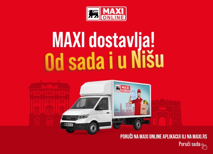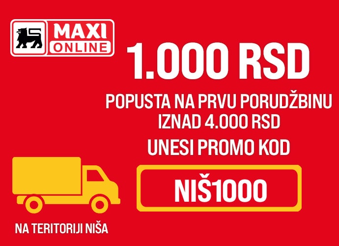 Maxi Online novim kupcima poklanja 1000RSD na prvu online kupovinu u minimalnoj vrednosti od 4000RSD. Unesi kod NIŠ1000 i ostvari popust! Promo kod se može iskoristiti za dostavu u Nišu.