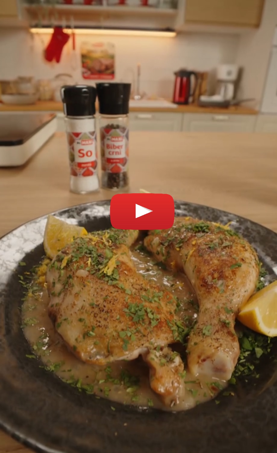 Dok se piletina prži, isecite crni i beli luk i izrendajte koru limuna. Spremnu piletinu prebacite u posudu za pečenje, a u isti tiganj dodajte maslac, isečeni crni i beli luk, malo brašna, limunov sok i pileći bujon. Sve to ukrčkajte pa dodajte koru limuna, šećer, vinsko sirće i još malo maslaca. Sos prebacite u posudu i stavite u rernu da se peče. Kada meso bude gotovo servirajte na tanjir i dodajte origano, peršun i kriške limuna.